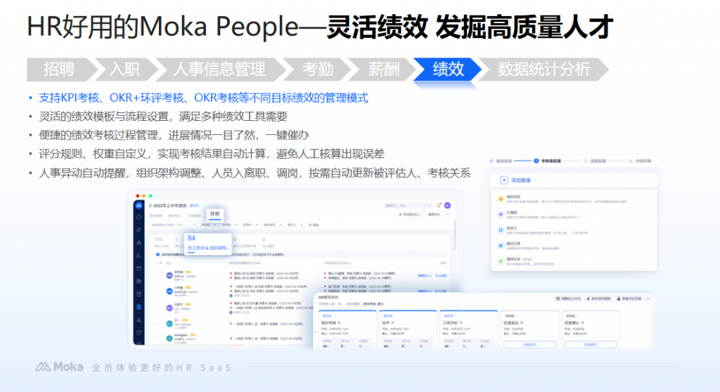 市场主流绩效管理系统软件各有侧重:部分产品擅长大型企业集团化管控,但操作复杂、成本较高;部分聚焦中小企业轻量化需求,却缺乏深度数据能力。Moka HR 系统凭借AI 原生架构脱颖而出,其绩效管理模块不仅覆盖全流程功能,还能与招聘、薪酬、人事管理等模块无缝衔接,实现员工全生命周期数据贯通。同时支持多终端协同与生态对接,适配不同行业、不同规模企业需求,兼顾易用性与专业性。