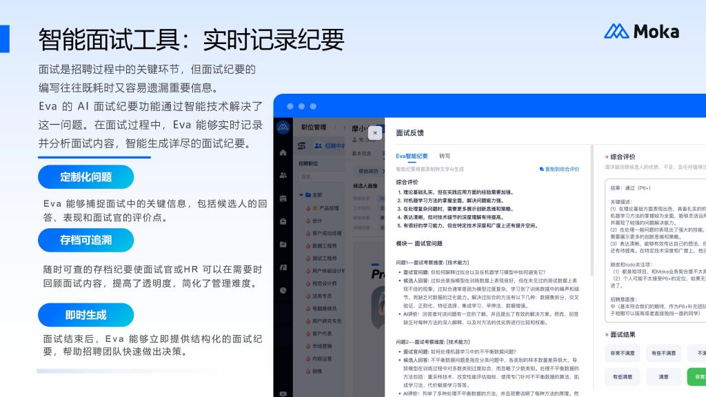 以 Moka 的视频面试功能为例,其实时协作评分设计可与招聘流程深度结合:面试官提交评价后,系统会自动生成候选人的综合评分报告,标注各维度优势与风险点;若候选人进入下一轮面试,前序评价会自动同步给新面试官,无需 HR 手动转发;决策环节,团队还能基于系统内的反馈记录,快速判断候选人是否符合录用标准,进一步缩短决策时间。