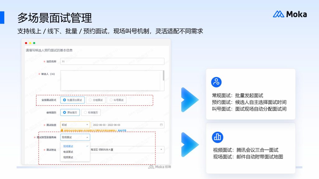Moka 人力资源管理系统的候选人自助平台,就具备自主预约、多渠道提醒、实时交互等功能,候选人可轻松完成面试相关操作,同时系统会自动收集候选人体验反馈,帮助企业持续优化流程。