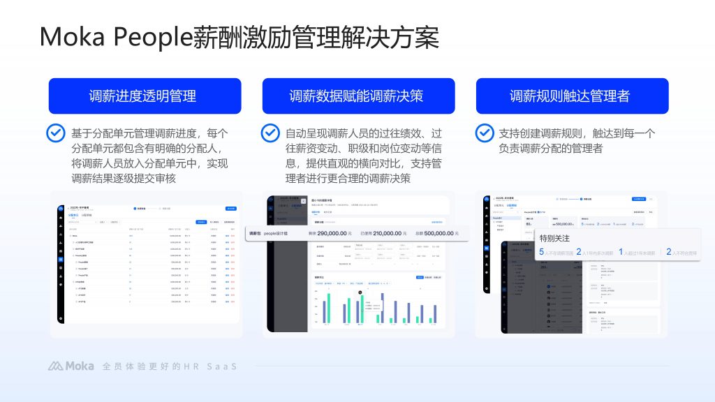 Moka People 智能化人力资源管理系统中的薪酬管理模块,依托 AI 技术实现了数据自动同步、智能核算与精准校验,让薪酬管理流程更高效、结果更可靠。此外,软件的易用性也至关重要,直观的操作界面与清晰的流程设计,能降低 HR 学习成本,快速上手使用。