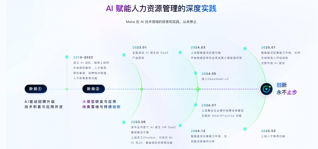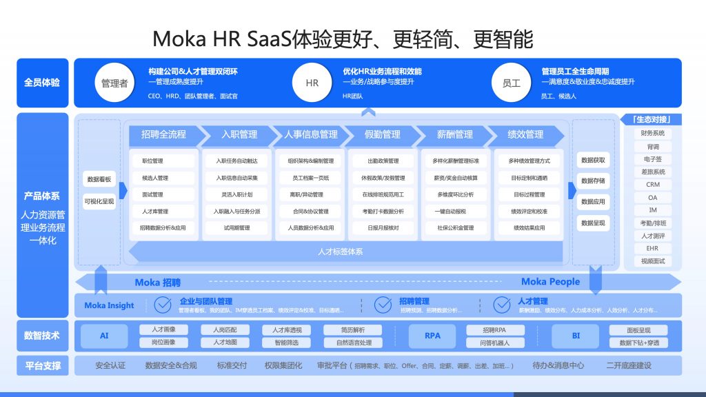 Moka专注于智能化人力资源管理的 SaaS 服务商,以 AI 与一体化体验为核心,聚焦招聘与人才全生命周期管理,为企业提供轻量化、高可用、易集成的人力资源数字化解决方案。