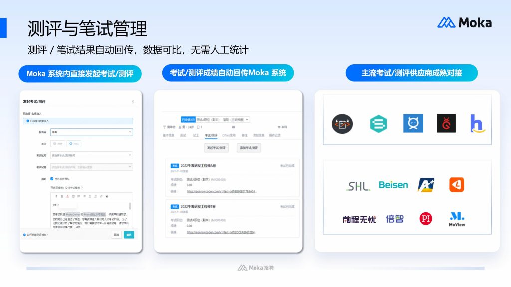 例如 Moka 远程面试管理系统,可自动同步面试官日程,根据双方空闲时段智能推荐面试时间,减少人工协调耗时;系统一键生成并发送附带专属视频链接的面试邀约,候选人点击链接即可进入面试间,无需额外下载插件,降低操作误差、