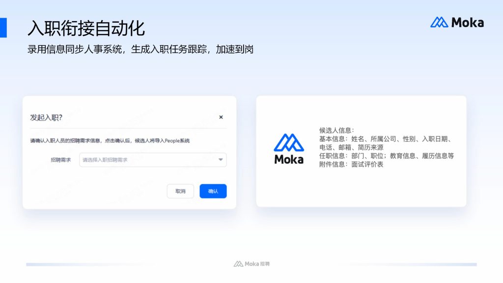以 Moka 入职管理系统为例,其支持自定义信息采集模板,可根据不同岗位、不同部门的需求调整字段,适配企业个性化管理需求;同时具备档案自动归档与版本管理功能,员工更新信息后,系统自动留存历史记录,便于追溯。此外,系统还能实现入职数据与薪酬、绩效等模块的联动,让沉淀的数据直接服务于后续 HR 业务,无需重复录入,真正实现数据价值最大化。
