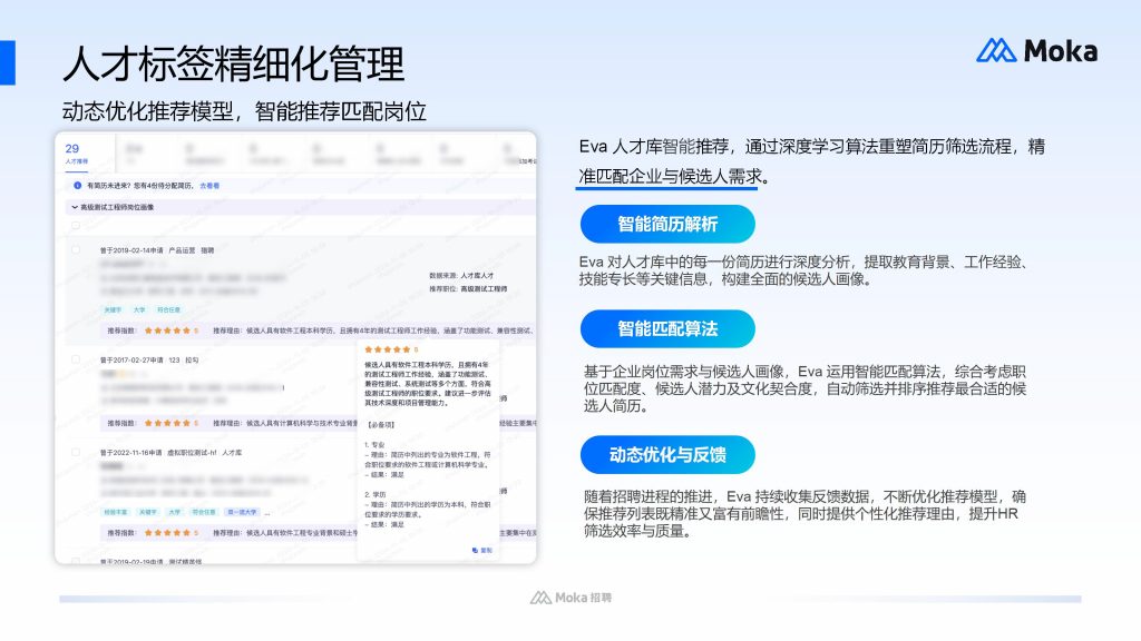 若企业有自建的招聘系统,可选择提供开放接口的 AI 技术服务商,实现 AI 功能与现有系统的对接,保障数据的无缝流转。在工具选择过程中,需注重工具的兼容性与可操作性,同时兼顾人才数据的安全性,确保 AI 工具在实现自动化直推的同时,能有效保护企业与候选人的信息安全。Moka Eva 作为 AI 原生的 HR SaaS 产品,其对话式 BI 功能可快速获取 AI 直推相关数据,为工具适配后的运营优化提供数据支撑。