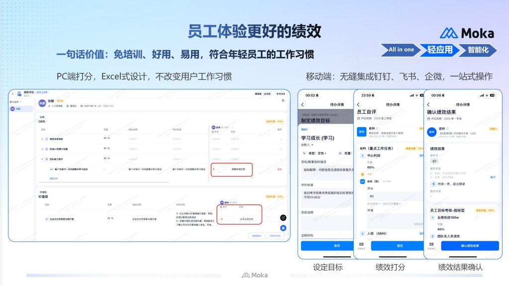 Moka 为中大型企业提供 AI 驱动的一体化绩效管理解决方案,从考核配置到智能面谈、从数据分析到人才识别,一个平台全部搞定。