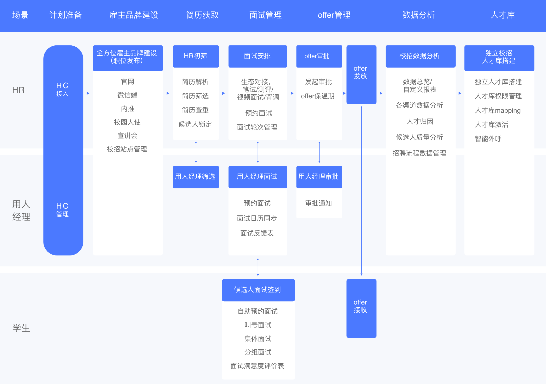 - 校招数据沉淀难校招流程各节点数据和校招结束后的招聘效果无数据记录与分析,导致校园招聘环节优化无数据可依,校招数据沉淀难。